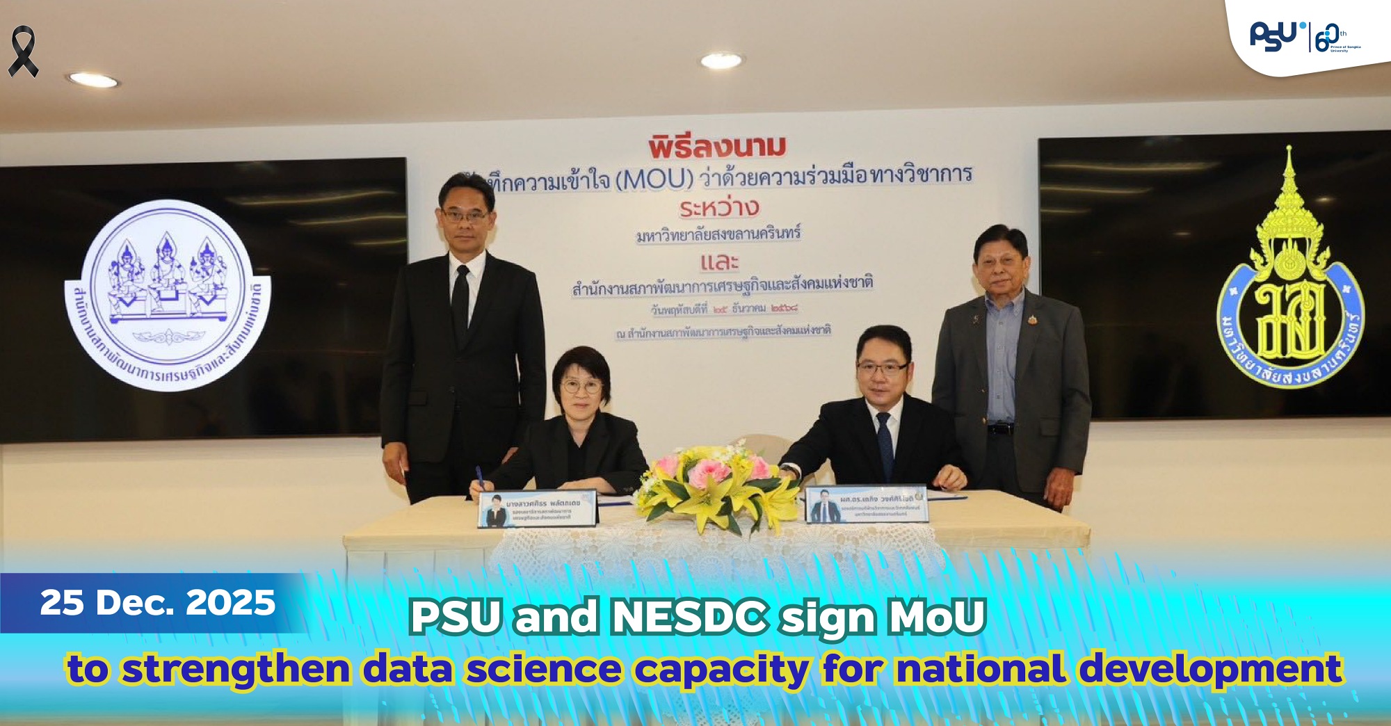 Prince of Songkla University (PSU) and Office of the National Economic and Social Development Council (NESDC) signed a Memorandum of Understanding (MOU) on academic cooperation to promote graduate education, research, and innovation, and to develop government personnel with expertise in Data Science to support Thailand’s sustainable economic and social development.