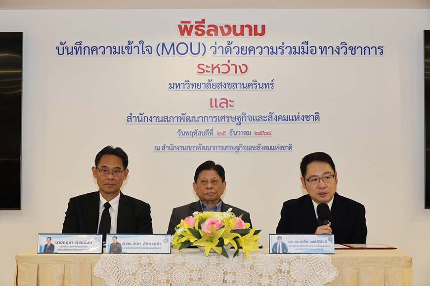 The signing ceremony was held at the NESDC Press Conference Room, building 5, and was attended by senior executives from both institutions. Mr. Danucha Pichayanan, Secretary-General of NESDC, delivered the welcoming remarks, while Prof. Dr. Sanit Aksornkoae, Chairman of the Prince of Songkla University Council, expressed congratulations. The MOU was signed by Ms. Sasithorn Plattadej, Deputy Secretary-General of NESDC, and Asst. Prof. Dr. Thakerng Wongsirichot, Vice President for Academic and International Affairs, PSU. The agreement is effective for three years (25 December 2025 – 25 December 2028).